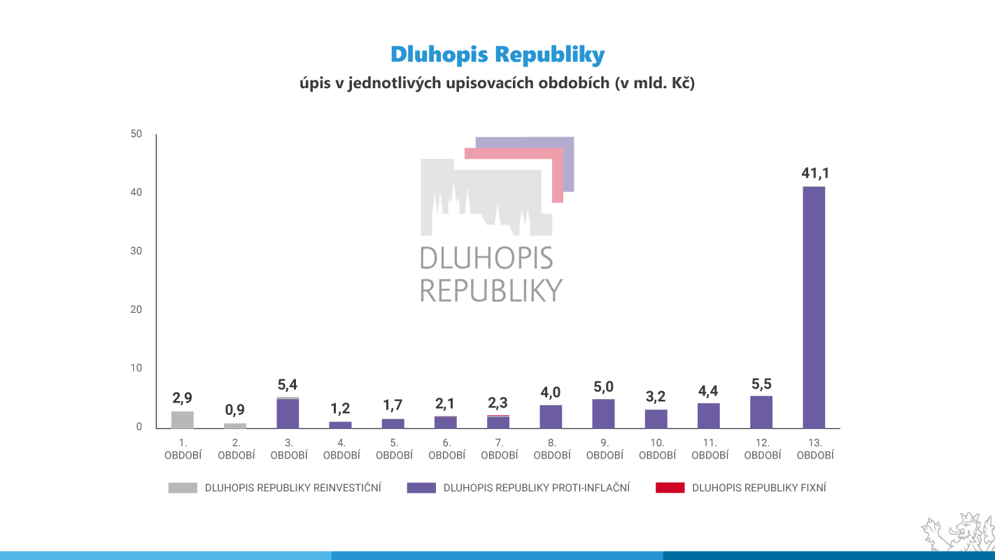 V průběhu 13. upisovacího období emisí Dluhopisu Republiky byl zaznamenán rekordní zájem občanů o pořízení státních dluhopisů, když byly upsány dluhopisy v celkové jmenovité hodnotě převyšující 41,1 mld. Kč. Jedná se o více než sedminásobek dosavadního maxima, kterého bylo dosaženo ve 12. upisovacím období a které činilo 5,5 mld. Kč. O rekordní výsledek úpisu se však nejedná pouze v kontextu obnoveného přímého prodeje státních dluhopisů, které jsou občanům nabízeny od konce roku 2018 jako Dluhopis Republiky, ale jedná se o naprosté maximum i v celé historii prodeje státních dluhopisů určených pro občany od roku 2011. Tehdy bylo dosaženo nejvyššího úpisu v prosinci roku 2012, kdy byly upsány dluhopisy v celkové jmenovité hodnotě téměř 30 mld. Kč.